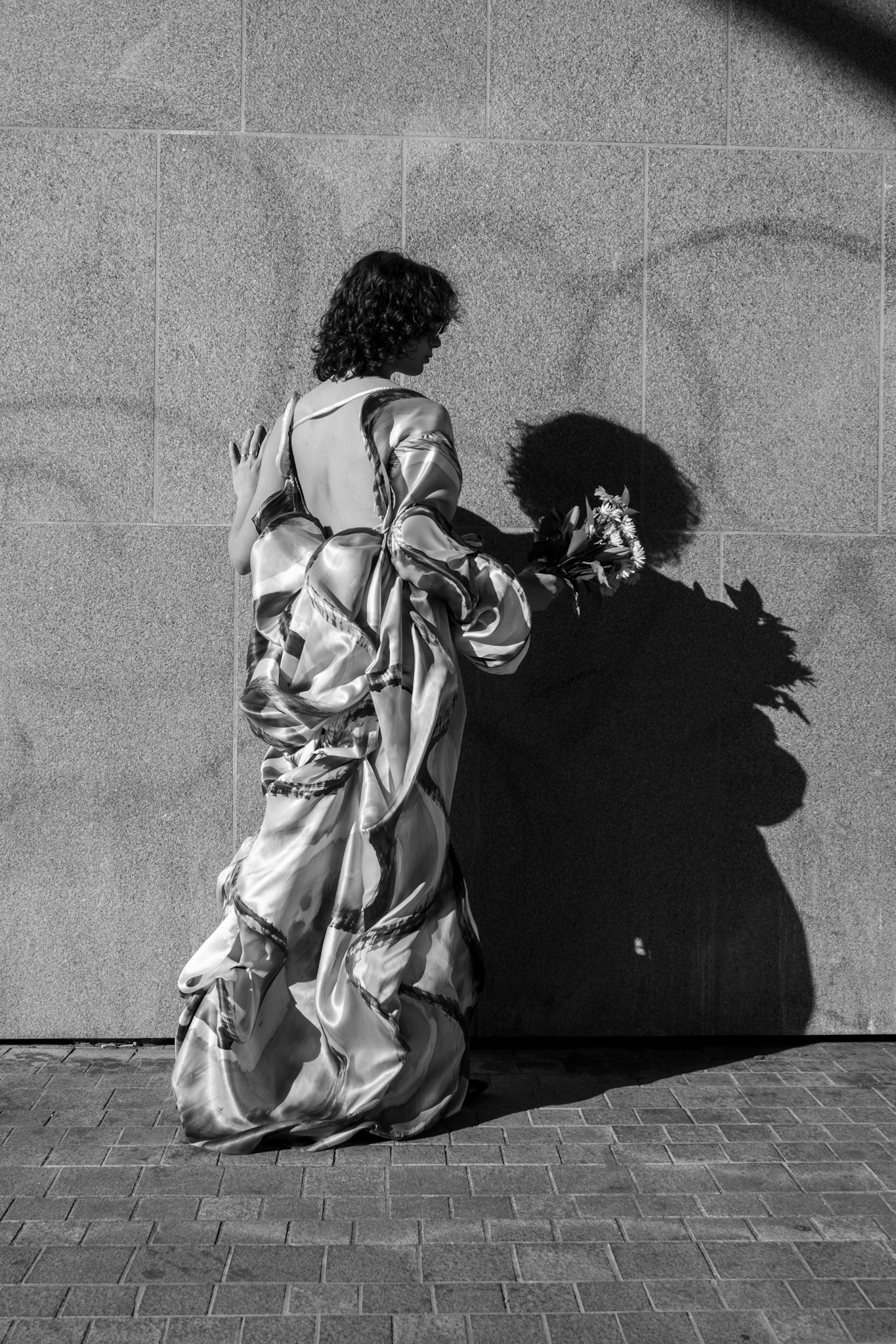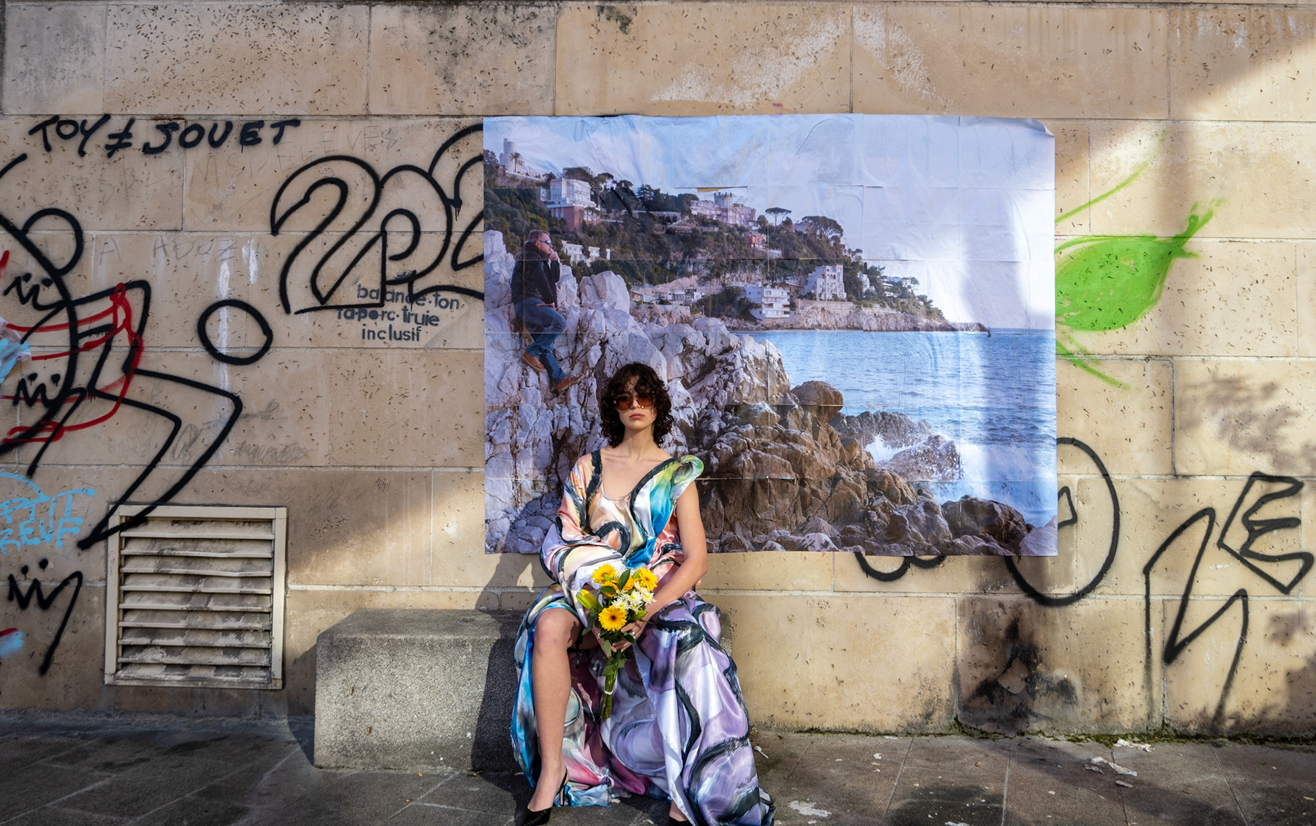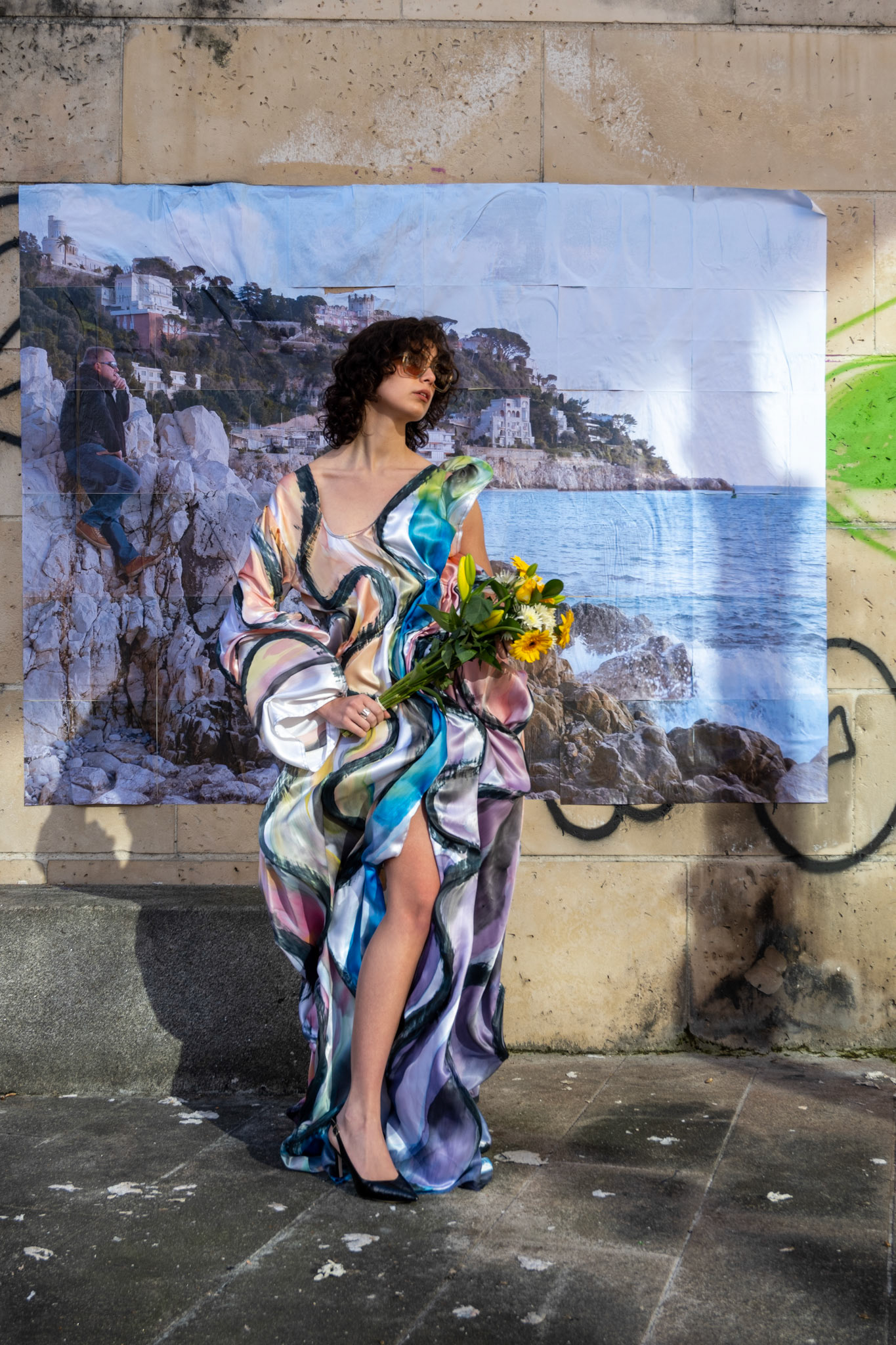 Dress draped with 5 meters of silk painted in ink. Picture taken in Nice and printed as a giant poster.